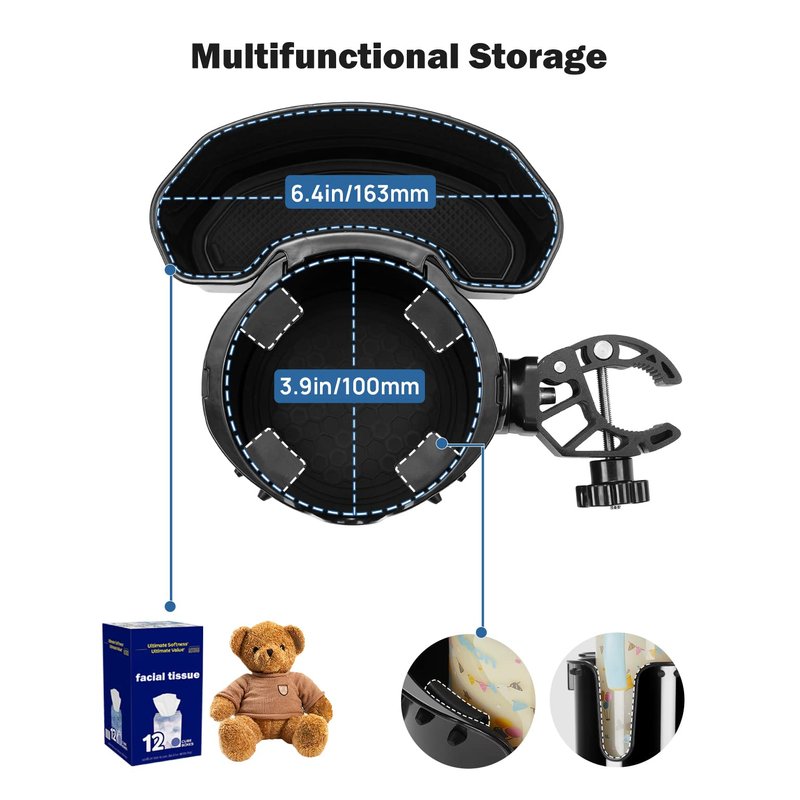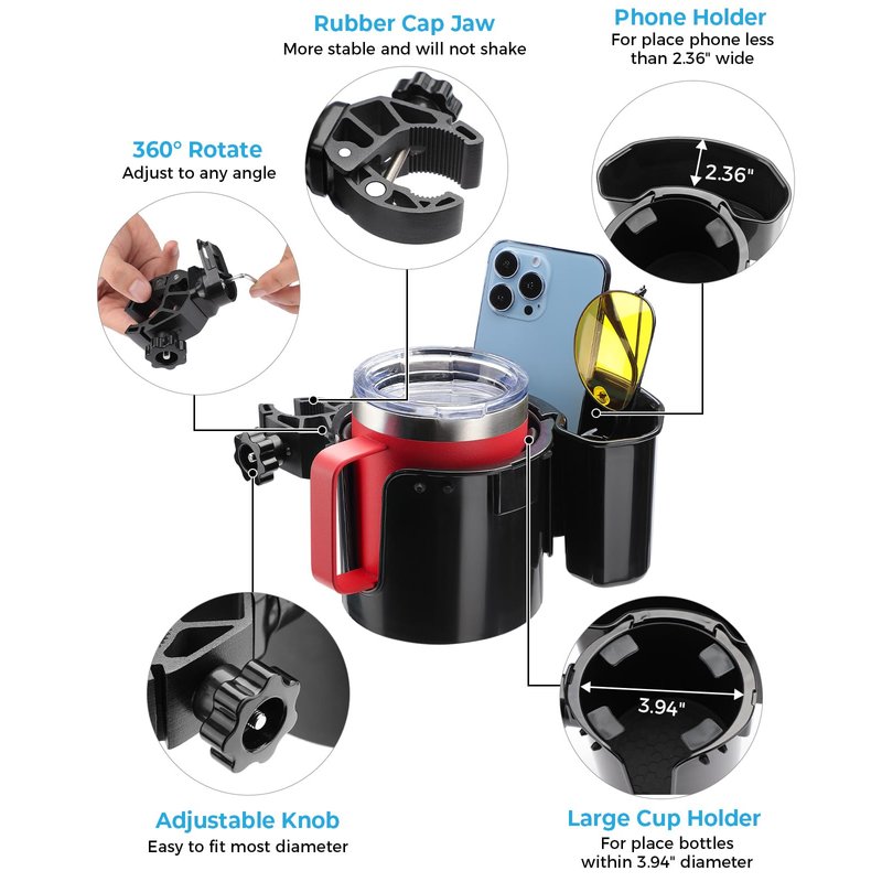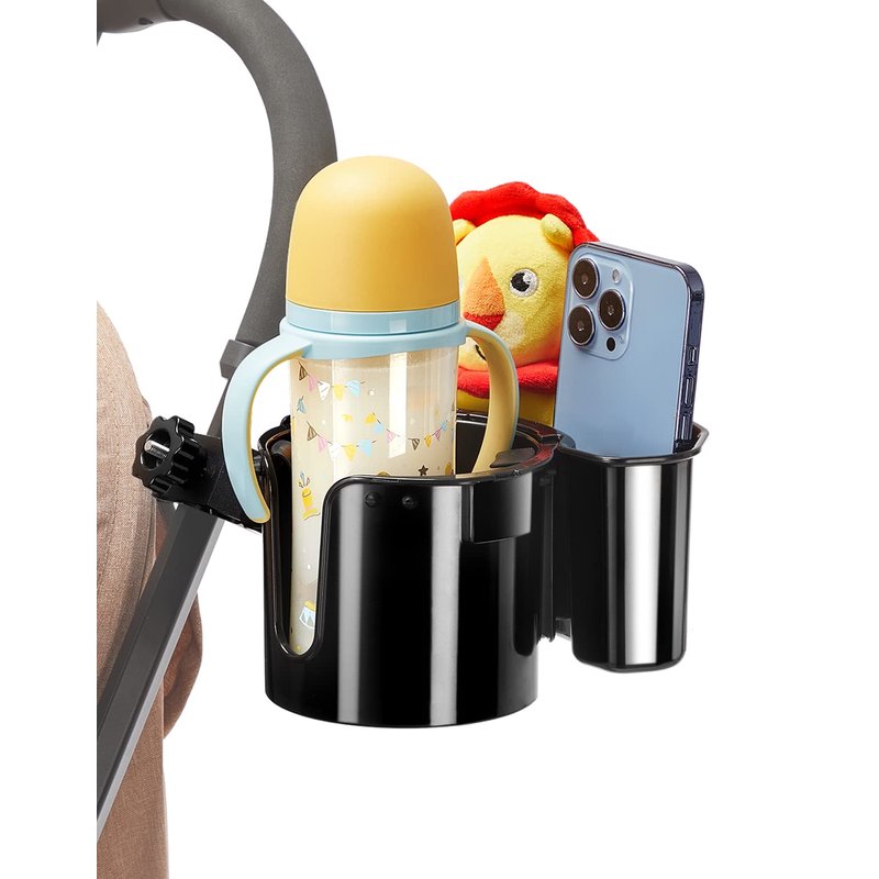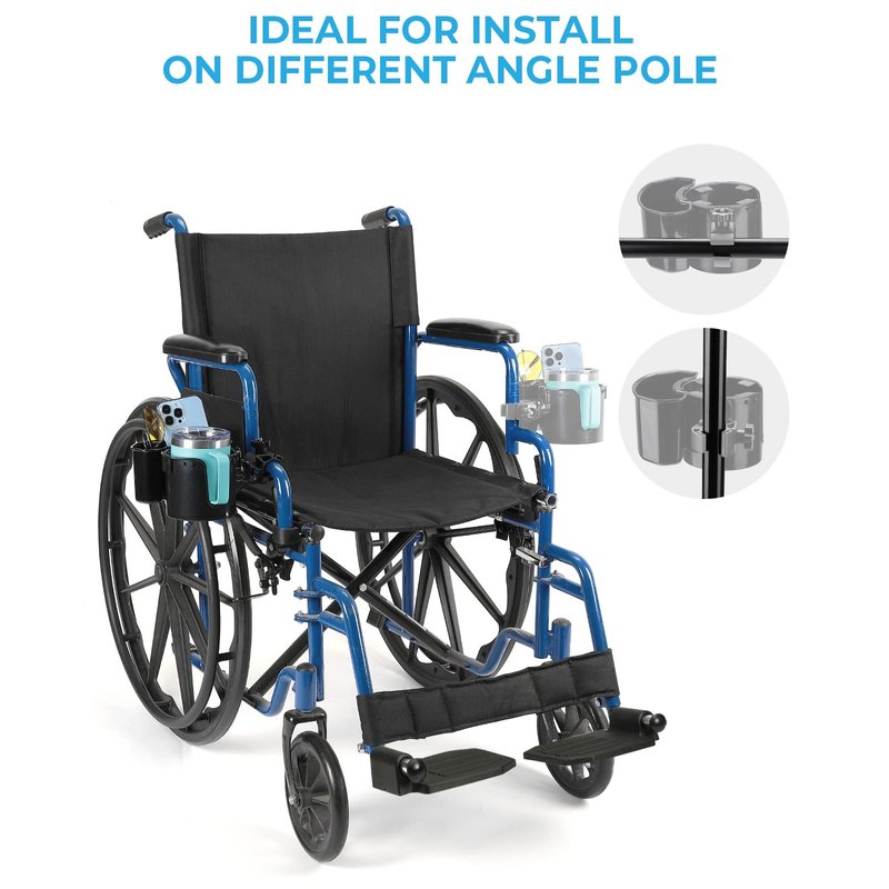 - 【Universal Cup Holder】 The multifunctional cup holder could be not only used for strollers but also rollators, wheelchairs, scooters, camping chairs, airport chairs, lounge chairs, lawnmowers, boats, kayaks, tractors, cruisers, etc. It is Suitable for 0.6-1.5 inch poles. And it also fits different sizes of bottles, like baby bottles, water bottles, coffee mugs, etc.