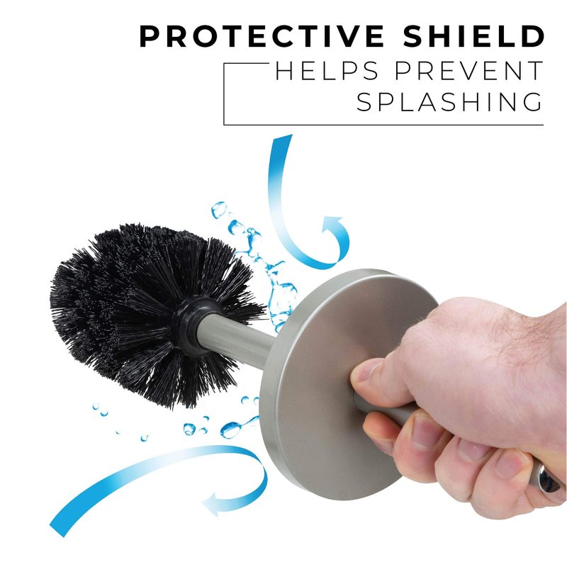 Composed of a sleek and contemporary matte black finish that will withstand pesky fingerprints and water stains, our Toilet Brush and Holder comes with a sturdy metal handle & frame that makes toilet scrubbing a breeze. The handle and brush connect into one piece while having the option to insert the round shield to protect against unwanted water droplets. This convenient design and finish works well with any bathroom decor, background/wallpaper/paint, or color-way! Sold as a single unit or set of 2 to help keep your bathroom tidy!