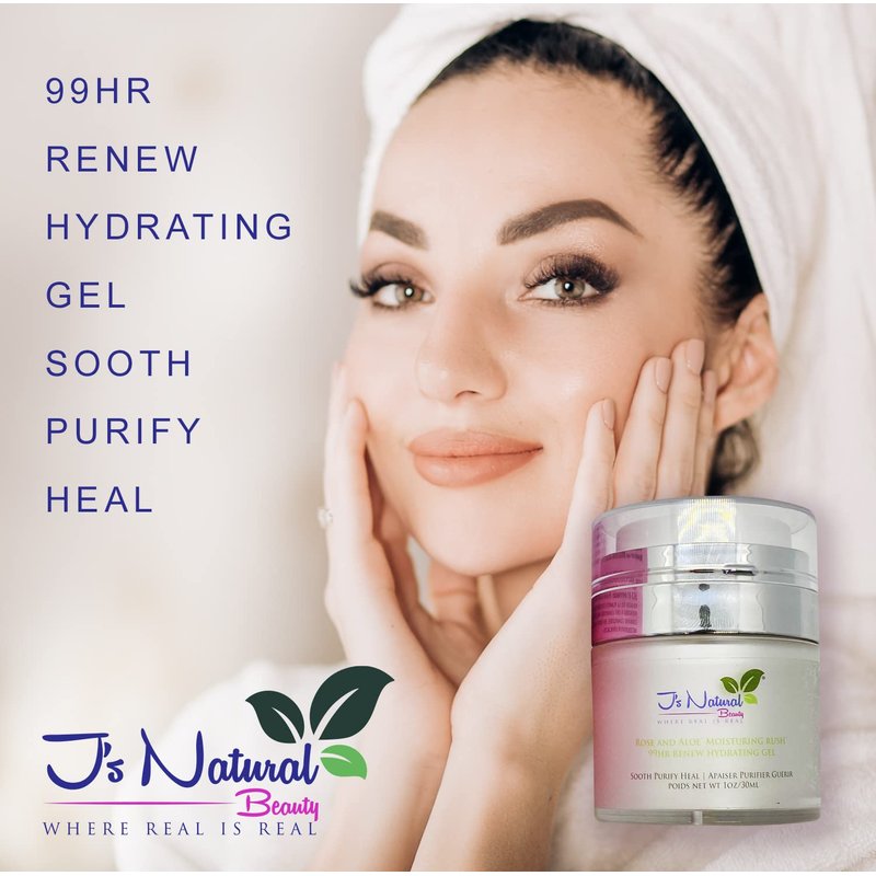 J'S NATURAL BEAUTY WHERE REAL IS REAL Unrefined Rose and Aloe Vera Moisturizing Rush 99 Hr Renew Hydration All Natural and Vegan Formula Highly Moisturizing Gel with Squalene