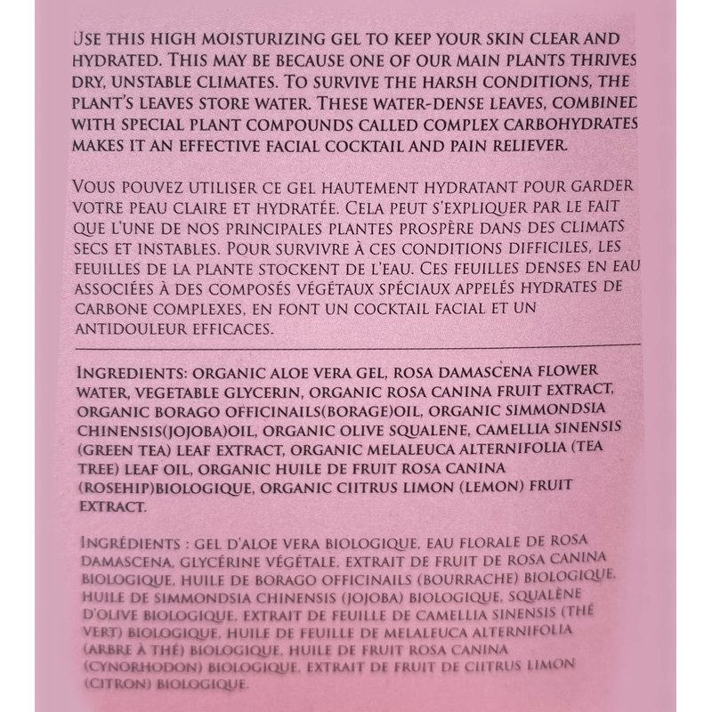 Use this moisturizing gel to nourish, protect, delay aging and repairs damaged skin. All natural moisuture and beauty ingredients to keep your skin clear and hydrated. This may be because one of our main plants thrives in dry, unstable climates. To survive the harsh conditions, the plant’s leaves store water. These water -dense leaves, combined with special plant compounds called complex carbohydrates, makes it an effective facial cocktail and pain reliever.