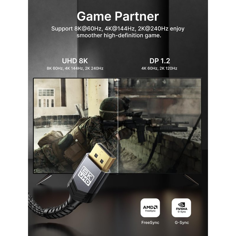 1.JSAUX DisplayPort cable: High Speed, Nylon Braided, Aluminum shell, Never Break, Gold-plated.