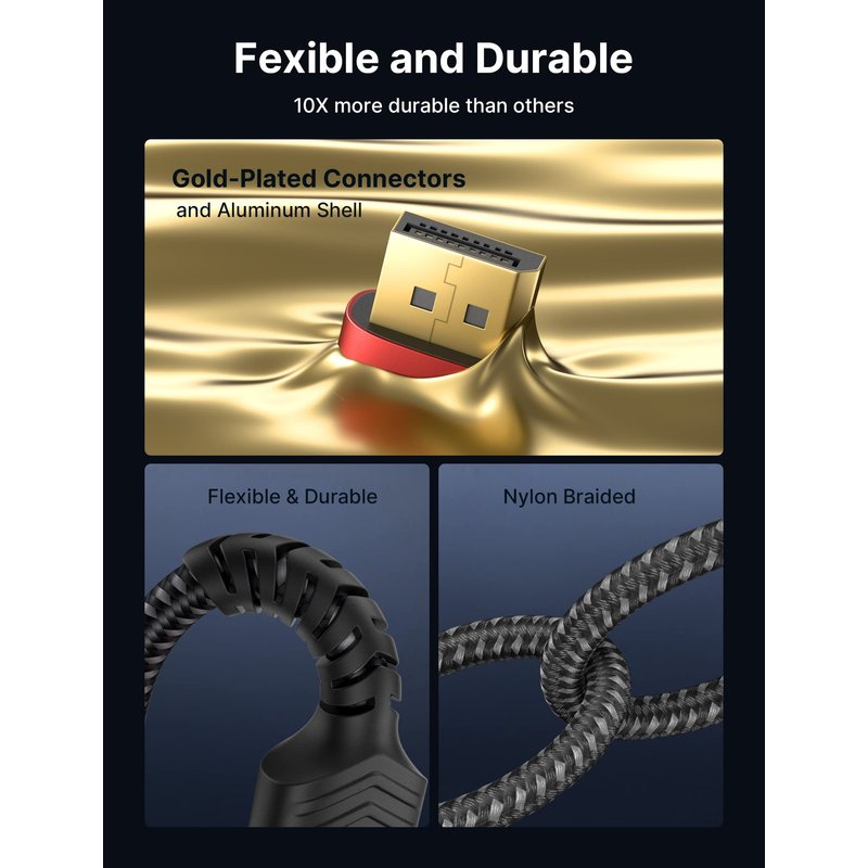 Strong Anti-interference Capability: Designed with tinned copper and triple-layer shielding, the DP Cable 1.4 is enough to transfer high-quality and stable video and audio signals, no worry about visual and audio glitches, artifacts, and audio/video synchronization problems. The aluminum shell, nylon braided cover and gold-plated connectors all ensure the superior durability under the heavy usage and multiple plugging and unplugging.
