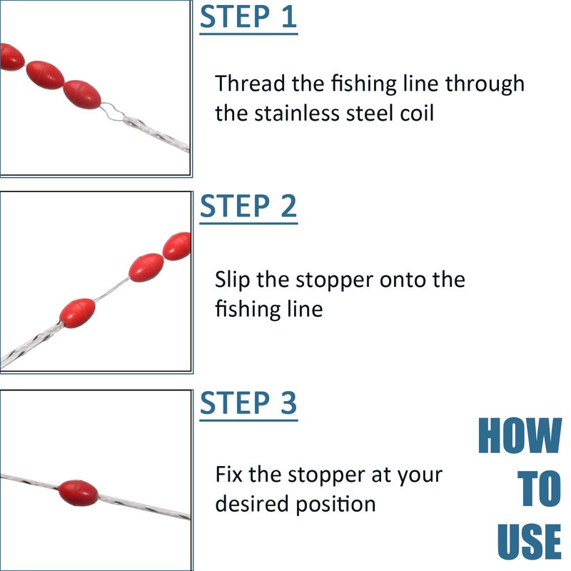 - EASY TO USE: Thread the fishing line through stainless steel coils, then slip the bobber stoppers onto the fishing line, and finally fix the stop at your desired position.