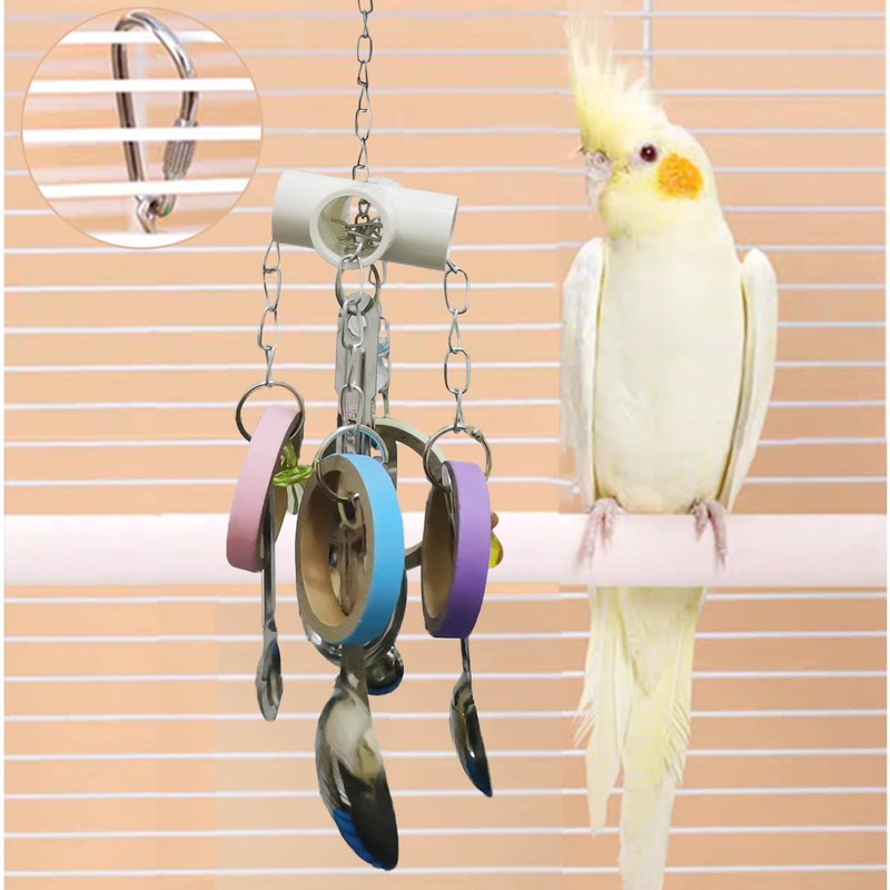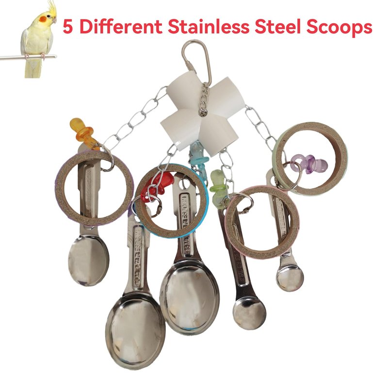 - 【Stainless Steel Scoops】Our bird toy for parrots has 5 different stainless steel scoops. The clatter of spoons attracts parrots to play. Parrot likes all the noise it makes when playing with this toy…Win,Win..