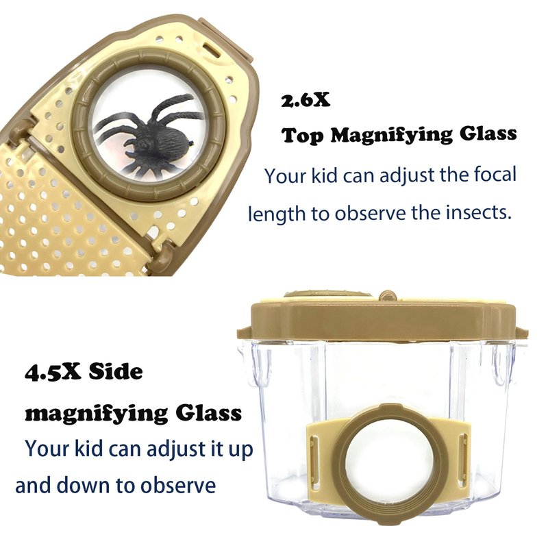 - 2.6 X lens and 4.5 X lens bug catcher: The bug catcher is with 2.6 X lens on the top and 4.5 X lens on the side for you to observe small insect more clearly.