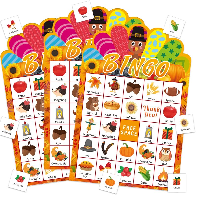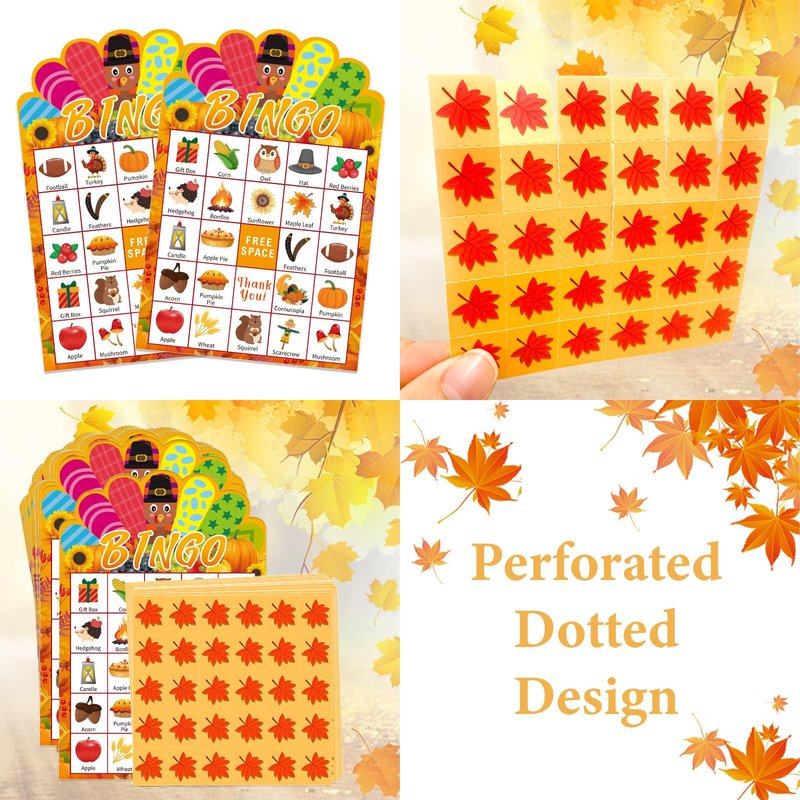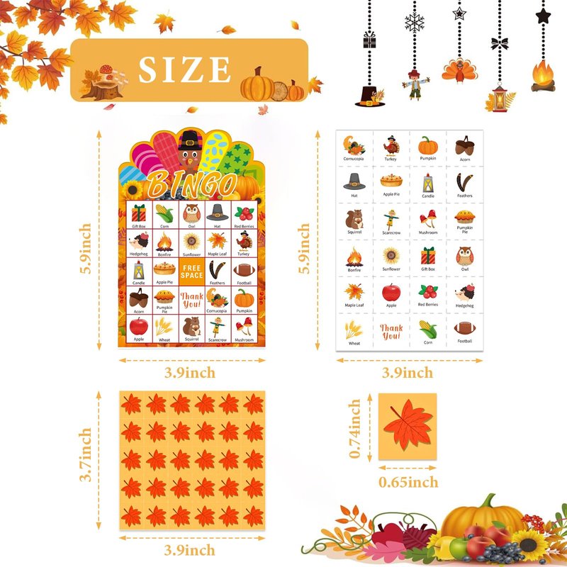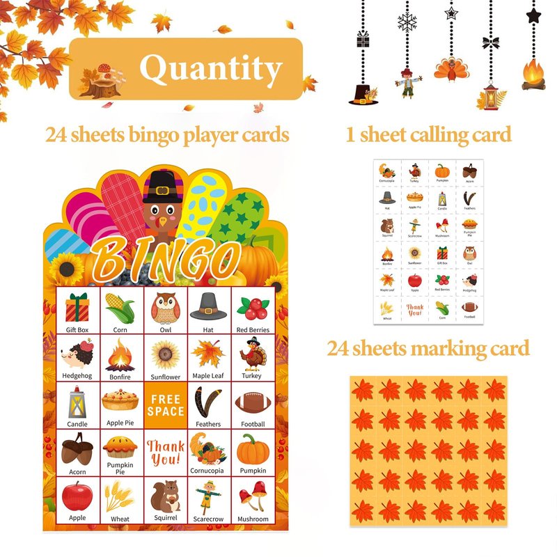 - Fall Thanksgiving Bingo Cards: The Thanksgiving bingo game set includes 24 sheets fall bingo player cards and 1 sheet calling card, 24 sheets maple leaves marking cards, enough fall bingo player cards can let members have fun together. Perfect for Autumn festival and Thanksgiving parties, these bingo game cards will keep kids and adults entertained for hours