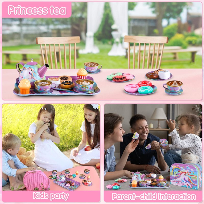 - 🌈Safe& Durable: The princess tea set for kids is made of non-toxic and lead-free tin material which is safe for kids to use. The dessert is made of BPA-Free plastic. To prevent the kids be scratched, all of the unicorn tea set is smooth, round and burr-free.
