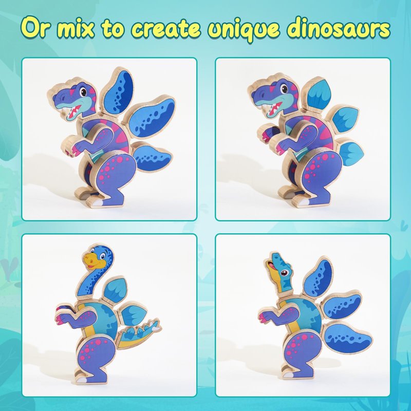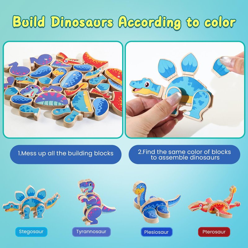 - 【Build Four Prehistoric dinosaurs 】:You will receive 30 pcs of wooden open-ended dinosaur blocks.Kids can combine the color-coded snap-together heads, legs, tails, and more to create 4 different dinosaurs, including Stegosaurus, Tyrannosaurus, Pteranodon, Plesiosaur. Also kids can use their creativity to mix and match the parts, creating their own special dinosaurs.