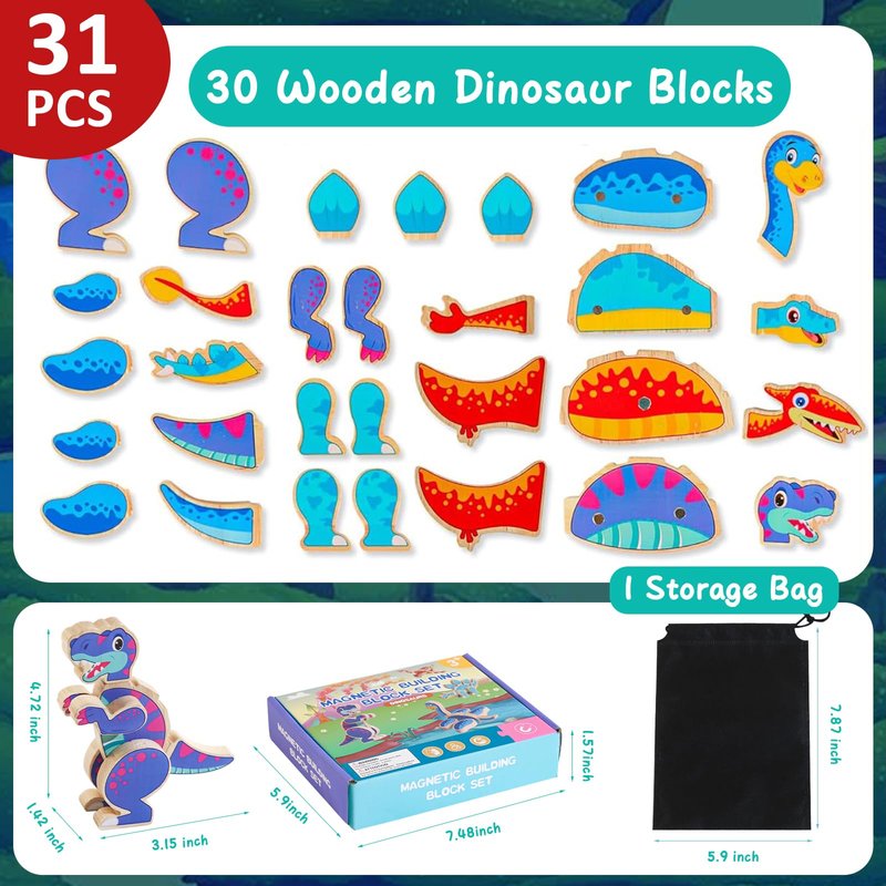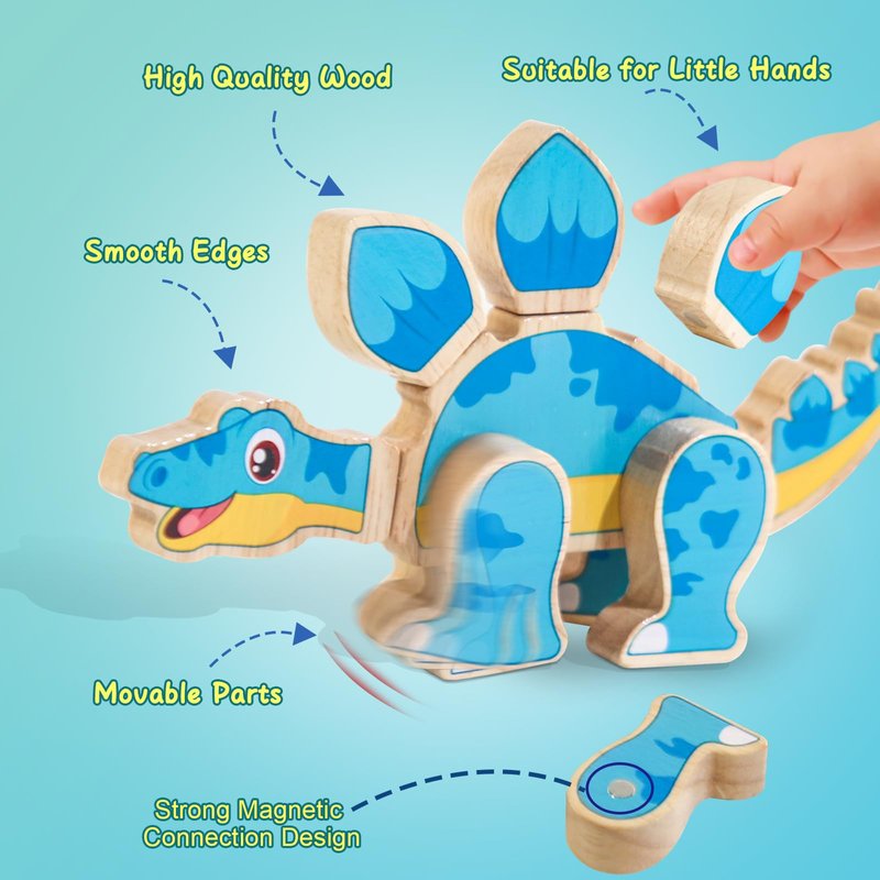 JugueteLand Magnetic Dinosaur Building Blocks, Wooden Dino Snap Blocks, STEM Take Apart Dinosaurs Playset, Montessori Fine Motor Skills Educational Learning Toy, Preschool Gift for 3 4 5 6 Years Kids