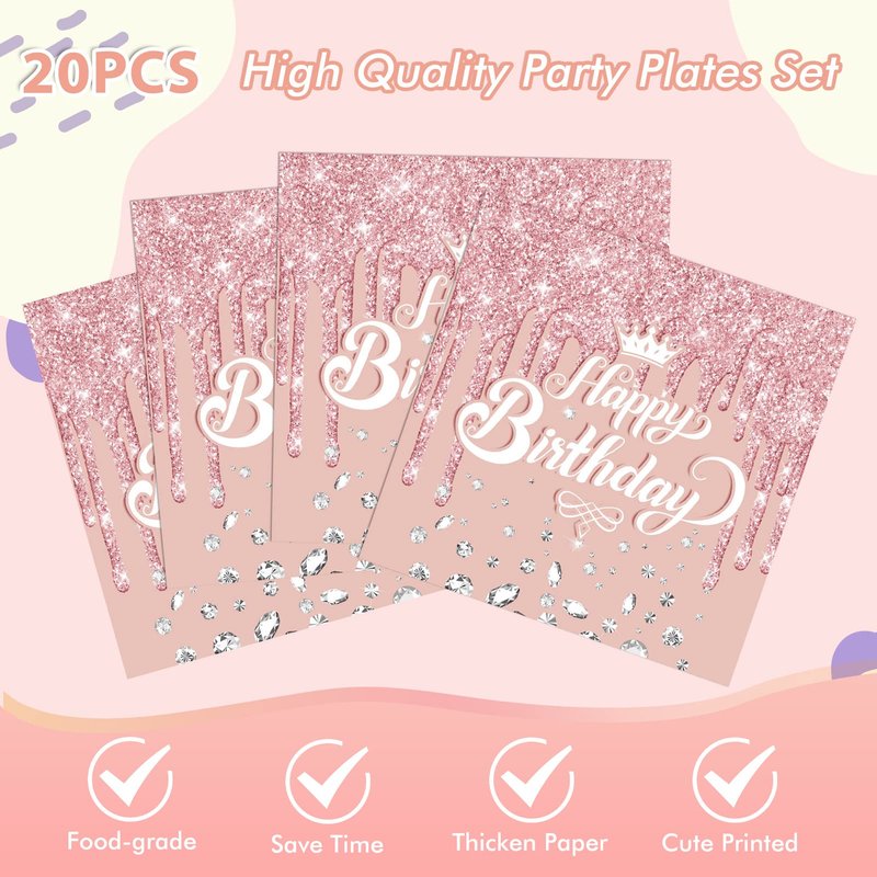 Juhap 41Pcs Rose Gold Birthday Party Decorations Pink Rose Gold Theme Birthday Party Supplies Birthday Tableware Includes 20 Plates 20 Napkins and 1 Tablecloth for Girls Women