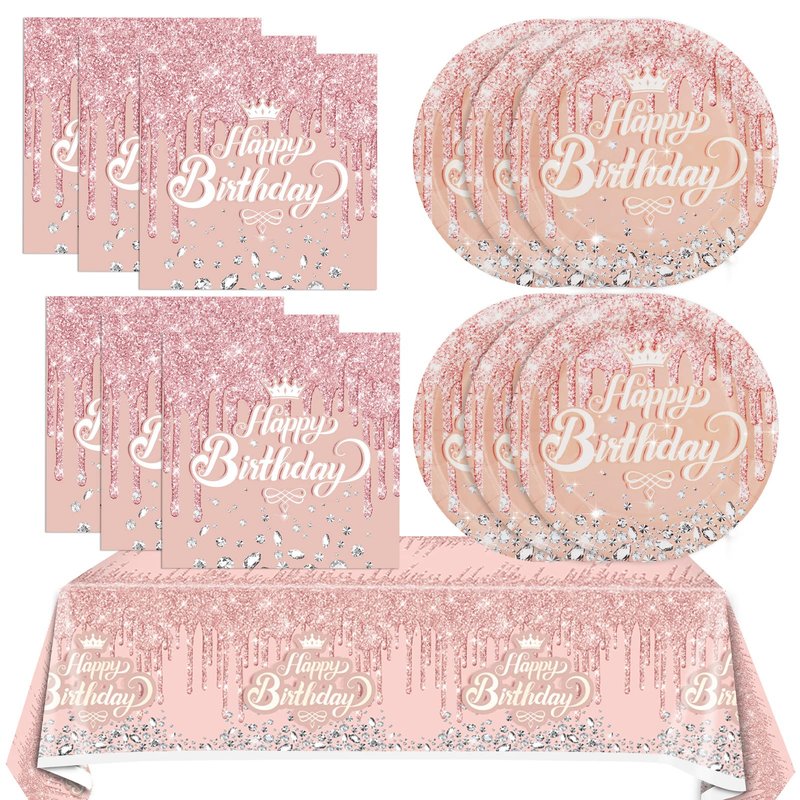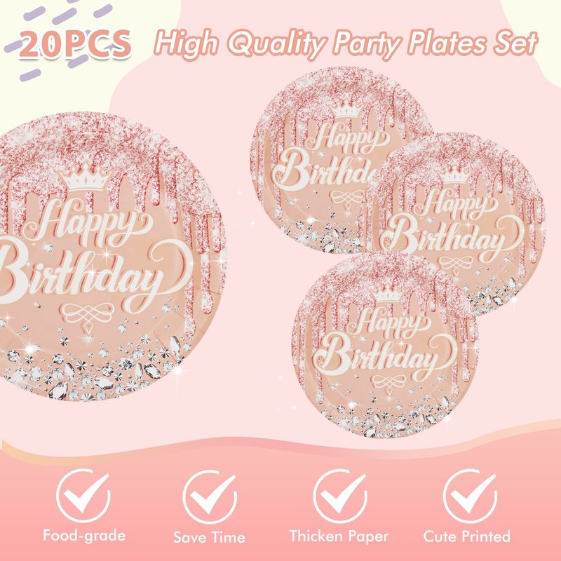 - 🌹HIGH-QUALITY: Happy birthday party tableware are made from food-grade cardboard, thickened and sturdy, can hold up well with any kinds of food. The napkins are soft and non-smell. The birthday supplies are designed in a rose and gold background, make the whole supplies set looks more elegant.