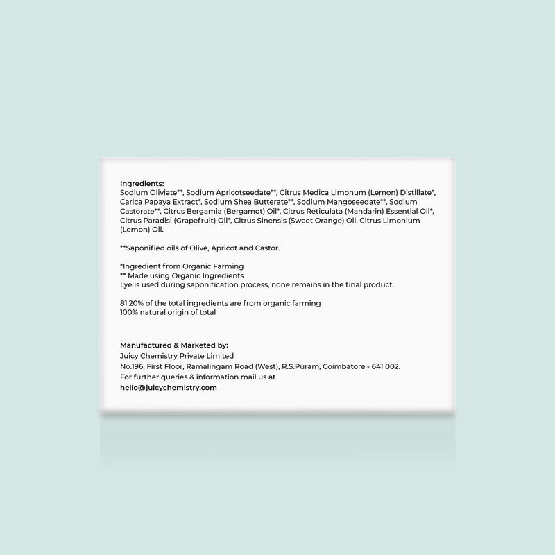 - WHY JUICY - Compared to other cosmetic companies, here at Juicy Chemistry we believe by being kind to the Earth, we are being kind to ourselves. Because of this, all of our Soaps are 100% Natural, Cruelty Free, and Preservative Free. In addition, all of our soap products are also Freshly Made, provide completely Transparent Ingredients, and are Dermatologically tested for Safety and Non-Irritants.