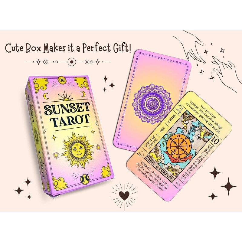 - Beautiful Design : Prepare to be enchanted by the uniqueness and beauty of the Sunset Tarot Deck. From the moment you lay eyes on the deck's elegant and vibrant images, you'll be transported to a realm where intuition and divination converge. The cute tarot cards deck comes beautifully packaged in a charming box, making it a perfect gift for yourself or a loved one.