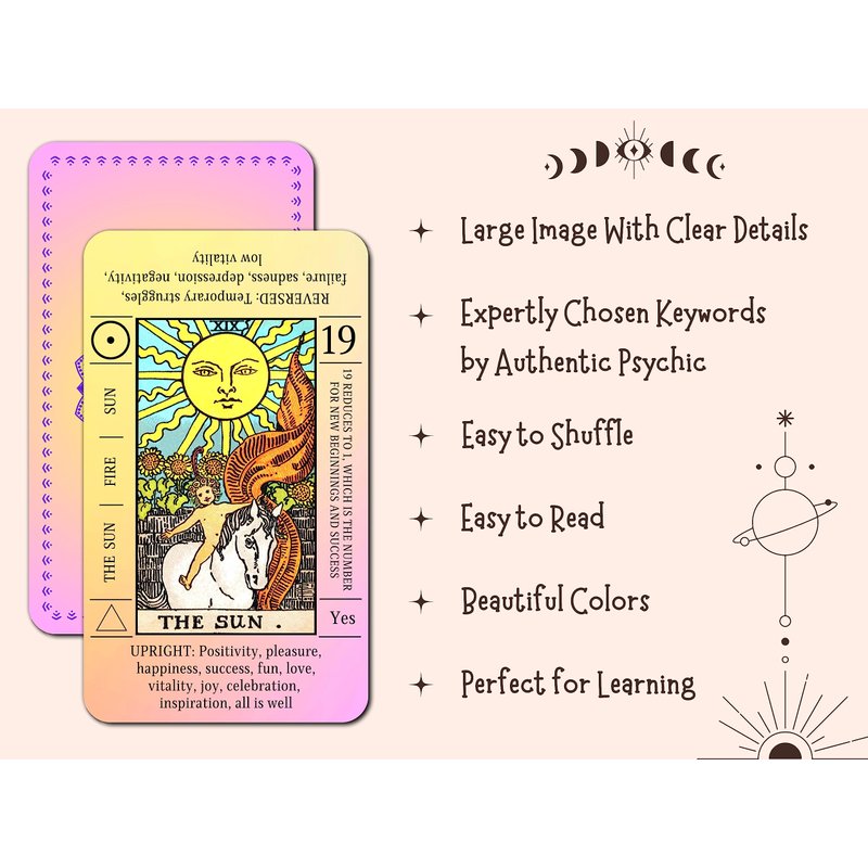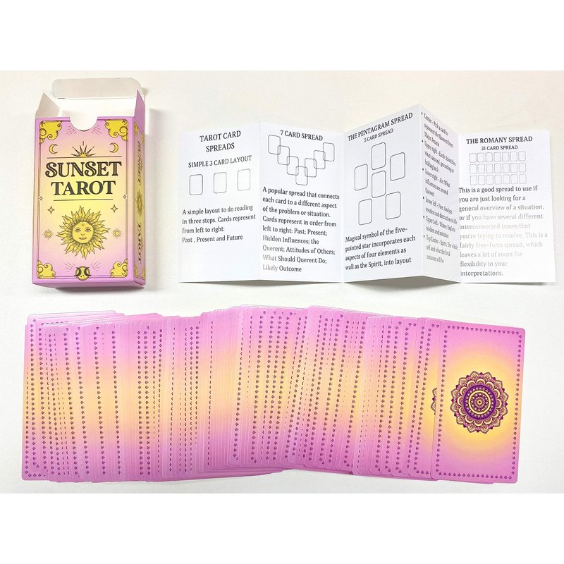 - Tarot Cards for Beginners : Unlock the mystical world of tarot with our exquisite Sunset Tarot Deck, carefully crafted to cater to beginners and seasoned tarot enthusiasts alike. This stunning deck features the classic Rider Waite images, enhanced with a blend of celestial elements including planets, zodiac signs, and numerology meanings, elevating your readings to new heights.