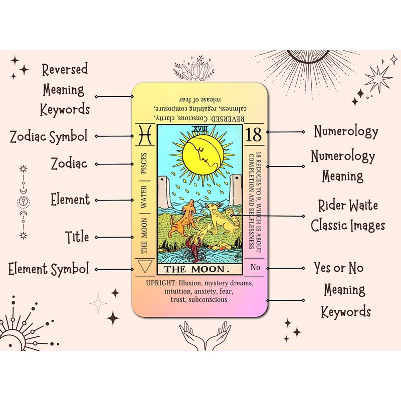 - Learning Tarot Crds With Meanings on Them : To enhance your tarot learning journey, each card in the Sunset Tarot Deck comes with meaning and reversed meaning keywords printed directly on the card itself. No more flipping through guidebooks or searching online for interpretations! The meanings are thoughtfully highlighted in different colors, making it effortless to distinguish between upright and reversed interpretations. This intuitive design allows for seamless learning and easy reference, empowering you to dive deep into the world of tarot with confidence.