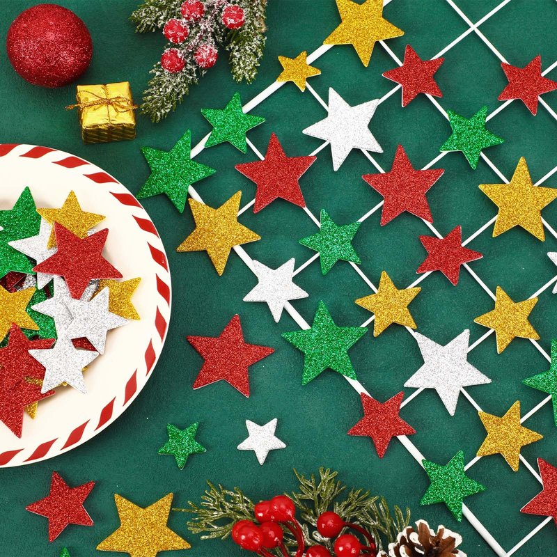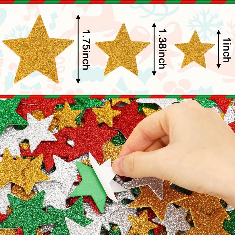 JULBEAR Star Foam Sticker, 300Pcs Christmas Glitter Star Shapes Foam Stickers for Kids Holiday Xmas Party Favors Toddler DIY Crafts Supplies Home Decorations(Red Green Gold Silver)