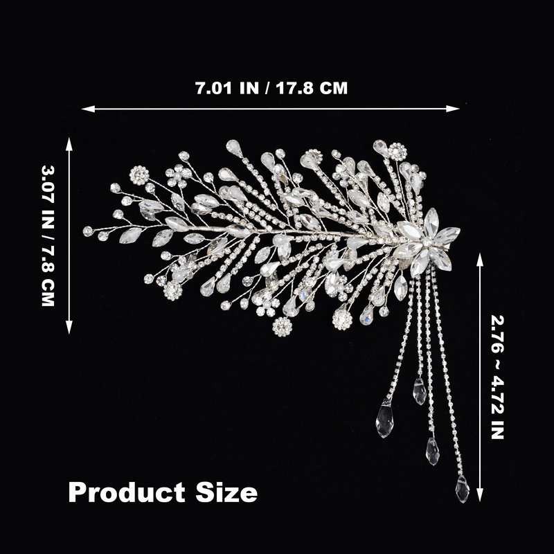 - 2.Women's wedding hair accessories with fringe, gorgeous and chic. The size of the side hair clip is about 7.01*3.07 inches (17.8*7.8 cm),The tassel length is approximately 2.76-4.72 inches, both women and girls can use it
