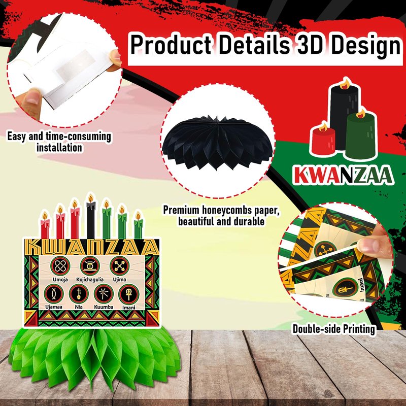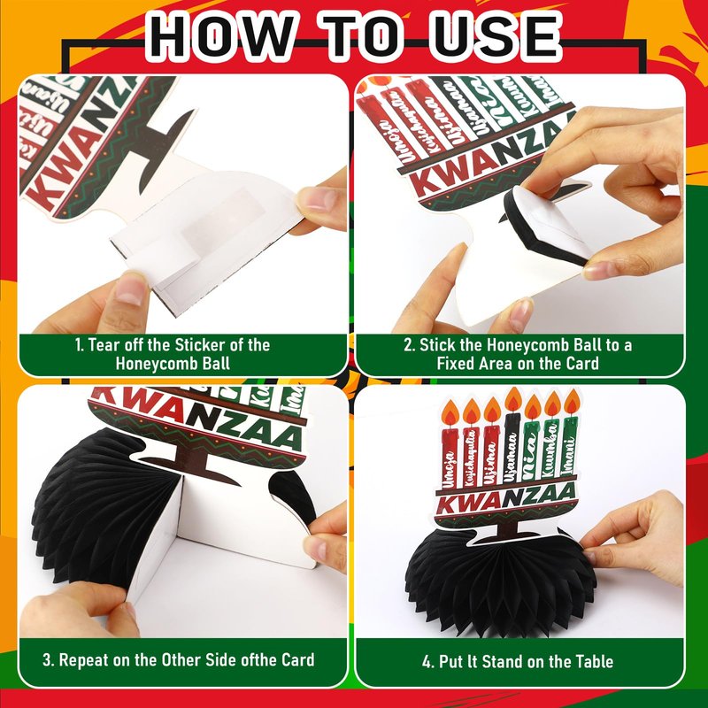 - Simple Operation: Kwanzaa table decor is easy to install. You only need to tear off the sticker of the honeycomb ball, stick Kwanzaa table decorations in the fixed area on one side of the card, unfold the honeycomb ball, and then stick on the other side of the card to easily complete the installation. The size of each Kwanzaa table decor is 15.24x17.7 cm/6x7 inches, which is small in size and light in weight. Kwanzaa decorations for office is easy to decorate your party