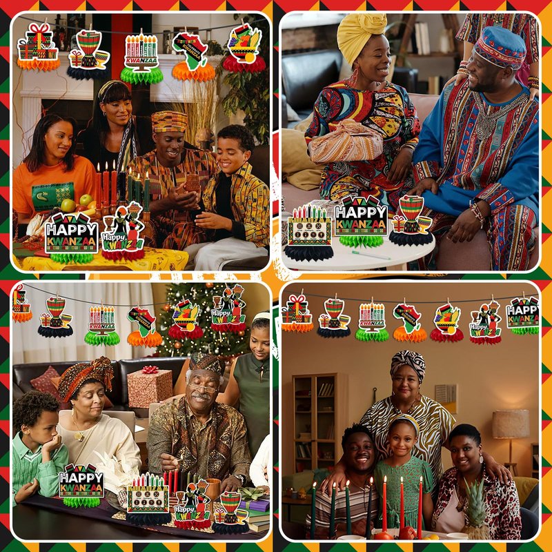 - Kwanzaa Theme Design: These Kwanzaa decorations for office have designed with various classic elements of Kwanzaa, such as candlesticks, drums, maps, gift boxes, fruits, and the words "Happy Kwanzaa". The honeycomb base adopts vivid and bright colors of red, green, black and orange, which ideally adds Kwanzaa atmosphere