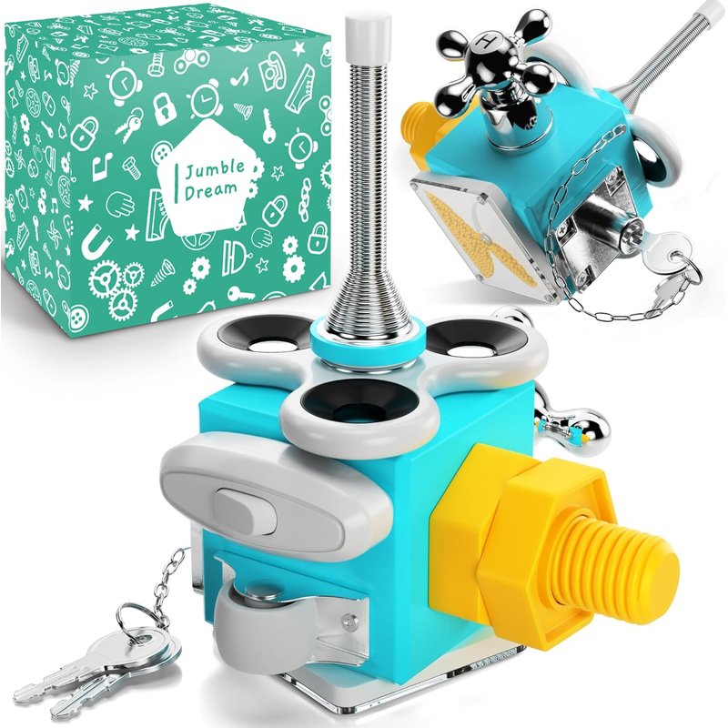 - BOOST COGNITIVE & MOTOR SKILL DEVELOPMENT: This Sensory Cube includes a spinning hourglass, wheel & door switch, spring doorstop, lock & keys, fidget spinner and a water tap making it a perfect sensory toys for kids with autism