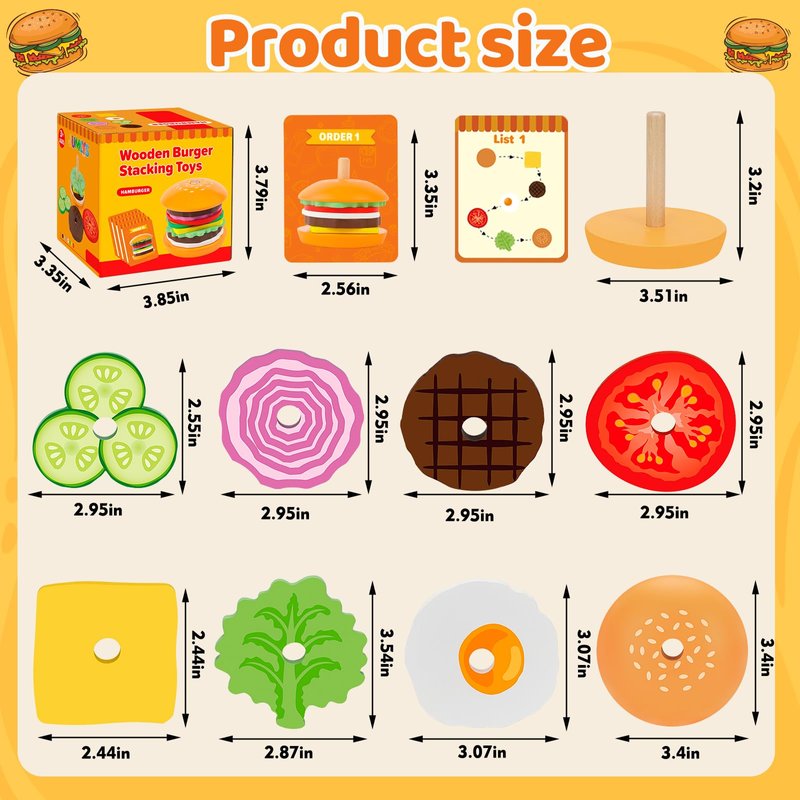 - Great Value Montessori Toys - Our wooden stacking burger toys contain 15 activity cards, a wooden base and 8 wooden ingredient pieces: lettuce, beef, onion, cheese, tomatoes, bread and egg. Lots of cards and treats, enough for kids to make burgers of all flavors, and the bright colors and realistic shapes will definitely catch the attention of kids and keep them hooked.