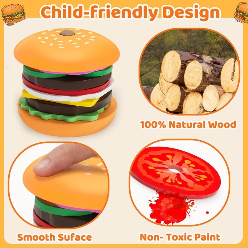 - Safe and Durable Stacking Toys - Our burger stacking toy is made of high-quality wood with a polished surface, which is not only smooth but also very durable, and all food ingredients pieces are made of odorless and non-toxic water-based paint, which guarantees the safety of kids in many aspects, and you can rest assured to hand it over children.