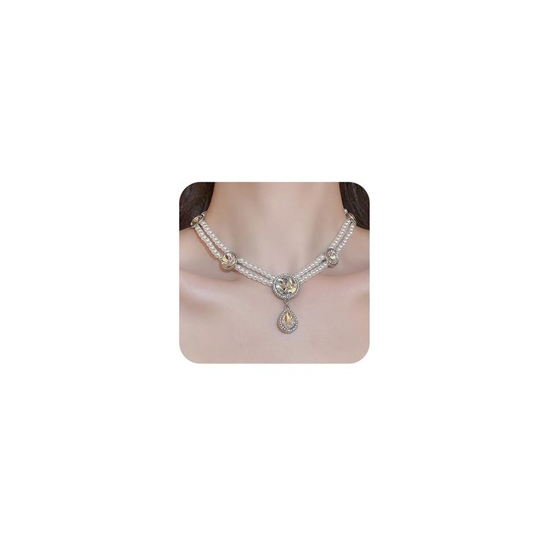 Jumwrit Vintage Layered Pearl Choker Beaded Necklace Boho Shiny Rhinestone Circle Teardrop Pendant 2 Tier Short Necklace Statement 1920s Flapper Accessories