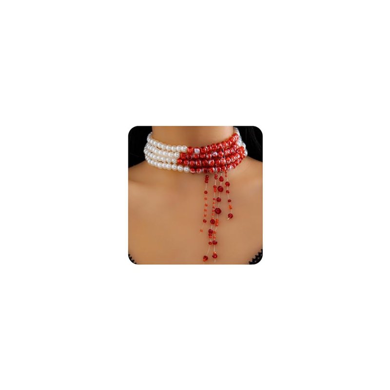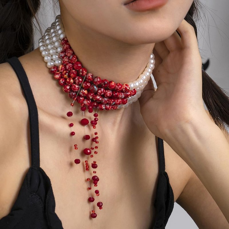 Jumwrit Vintage Layered Pearl Choker Necklace Chunky Chain Multi Strand Pearl Beaded Necklace Rhinestone Crystal Tassel 4 Tier Halloween Vampire Necklace Statement Accessories for Women (Red)