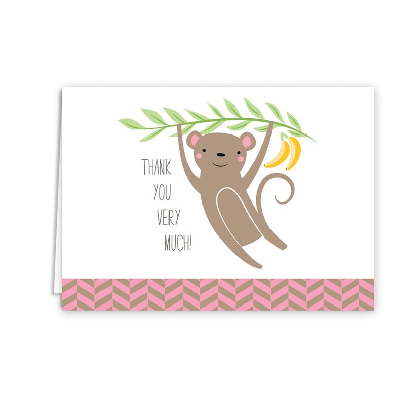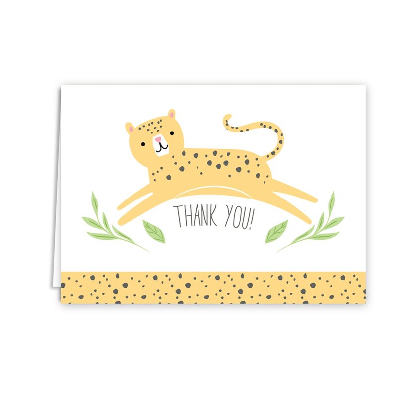 - Design: Adorable jungle animal thank you cards. There are cards of each design. Cards feature a zebra, elephant, monkey, lion, cheetah, and giraffe. Click on the alternate images to display each design included in pack. Cards are printed on high quality white cardstock.