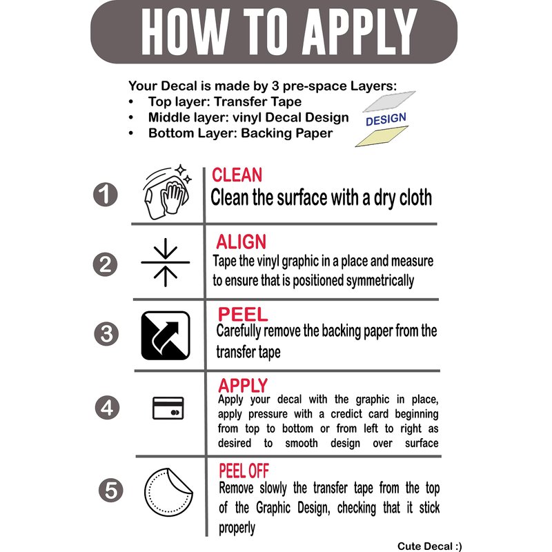 - EASY INSTALLATION - DYI product, our decals are easy to apply and easy to remove, precut with precision HD cutting equipment just peel and stick, apply slowly to a flat surface. Simply clean your surface, ensuring it's oil-free, peel off the sticker, and slowly apply it using our transfer film.