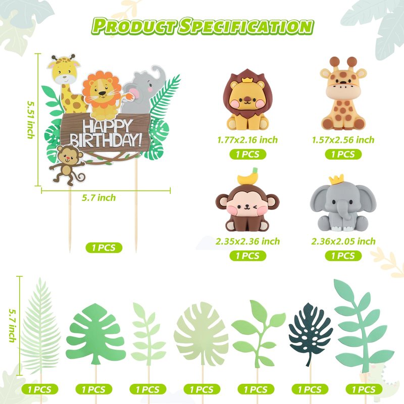 - 【Cute Jungle Animal Cake Toppers Set】You will receive 4 Pcs Soft Clay Animal Cake Toppers (Monkey, Giraffe, Lion, Elephant), 1Pcs Happy Birthday, 7 Pcs leaves.The specific dimensions are shown in the picture. Highlight your cake with our Safari Animal Cake Toppers! You will be your child's cake master!
