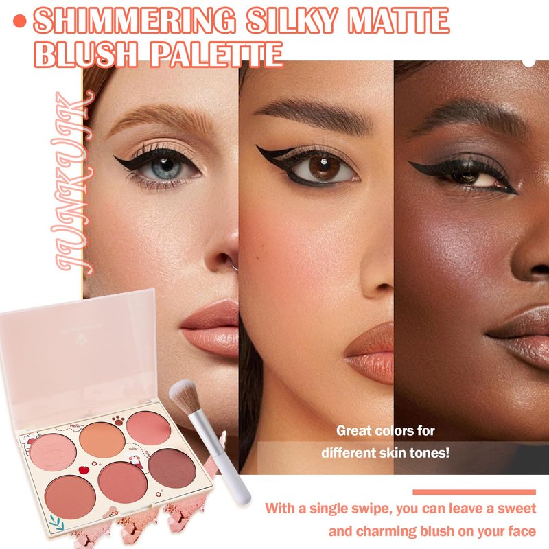JunKuJk 6 Colors Blush Palette,Shimmer Silky Matte Blush Powder Palette,Professional Cute Face Contour Highlighter Blush Palette with Blush Makeup Brush
