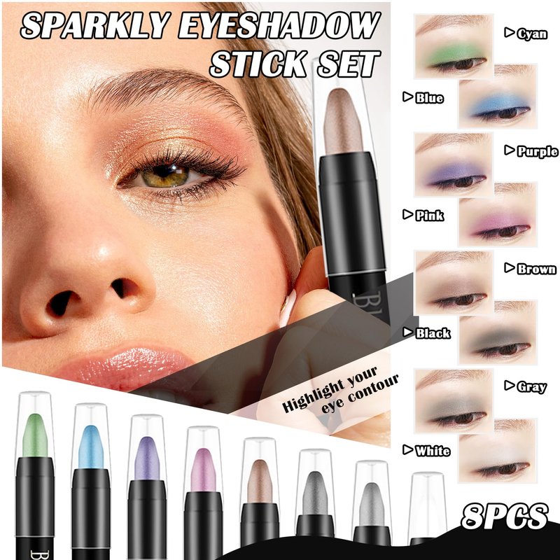 - ✨【Gorgeous Colors】The Eyeshadow sticks set comes in 8 different colors: pearlescent white, dazzling grey, pearlescent black, dreamy golden brown, rosebud pink, purple, greenish cyan and dazzling blue, which can satisfy your needs for multi-color and personalized makeup, and help you to create multiple styles of dazzling and glamorous eye makeup.