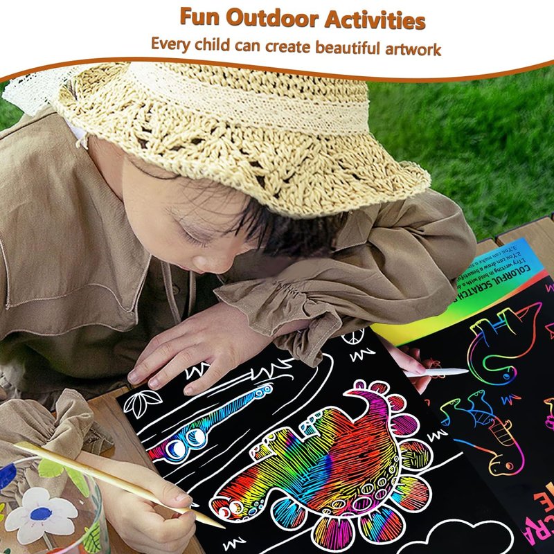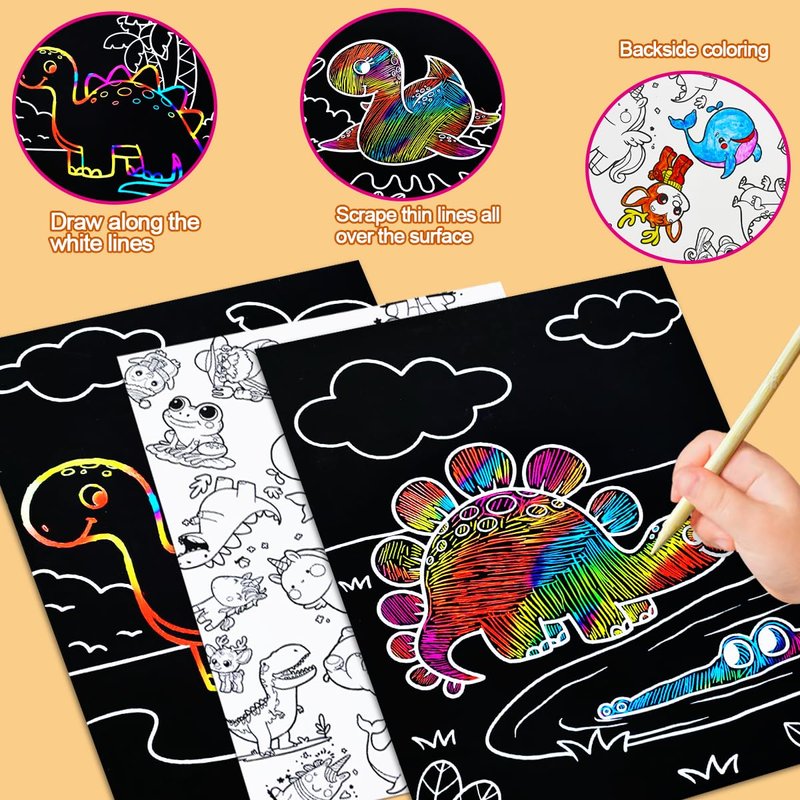 Unleash your child's creativity with our scratch art set! This exciting arts and crafts kit for kids ages 4-8 lets them create vibrant, rainbow-colored masterpieces by scratching away the black coating on the paper. The scratch art papers reveal brilliant colors underneath, allowing your little one to explore their artistic side. This engaging activity encourages hand-eye coordination and imagination. The set includes scratch papers, stylus tools, and a dinosaurs-themed scratch notebook for extra fun. It's the perfect stocking stuffer or gift for boys who love crafting. Spark their joy with this unique scratch paper art experience!