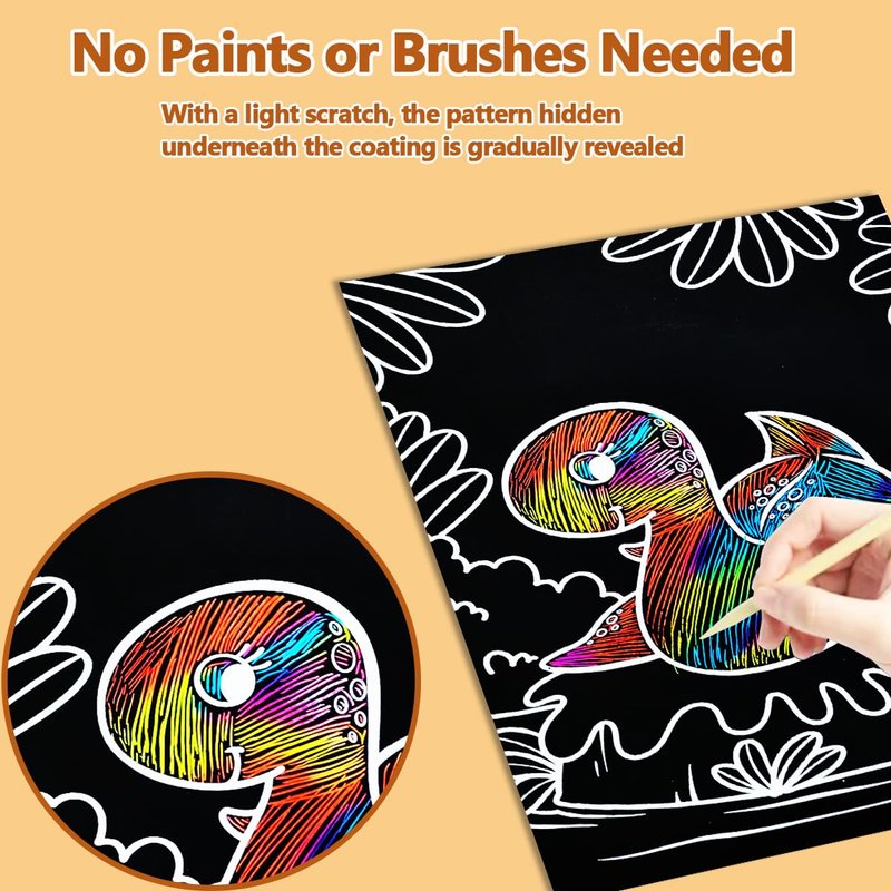 - 【Magical Rainbow Scratch Paper】Reveal colorful pictures of dinosaurs by drawing and scratching over the images! Kids scratch art is designed with two different options, you can scratch off it all to get the rainbow dinosaurs, or outline the pattern you want to design along the designed lines, the rainbow and black color match, more show your artistic talent. Ideal scratch art for kids, rainbow scratch paper, scratch paper art set for kids, scratch paper art set, rainbow scratch paper for kids