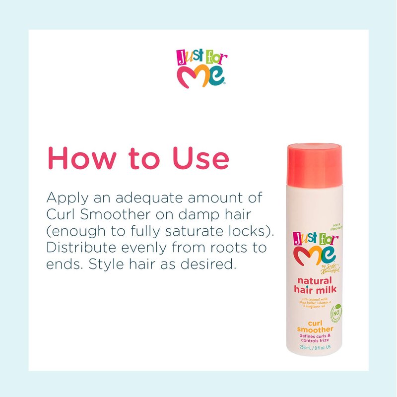ABOUT THE BRAND - Just For Me Natural Hair Milk products are designed to easily provide gentle hair nutrition for kids. From defining to moisturizing hair, our products were crafted with children in mind. PROVEN HAIR CARE - Just for Me Natural Hair Milk Curl Smoother is a lightweight, milky creme that helps to control frizz & define the curls of natural hair. The unique formula leaves each tender coil bouncy, beautiful & touchable. FEATURED INGREDIENTS - Enriched with Coconut Milk: Replenishes moisture, naturally softens and detangles; Shea Butter: Deeply moisturizes, helps strengthen and protect; Sunflower Oil: Stimulates hair growth and prevents breakage. NATURALLY FORMULATED - The ingredients within Just For Me Natural Hair Milk products are free of harmful components, including formaldehyde, DEA, sulfates, & parabens; using natural ingredients to provide high quality, safe products. HOW TO USE - Apply an adequate amount of Curl Smoother on damp hair (enough to fully saturate locks). Distribute evenly from roots to ends. Style hair as desired.