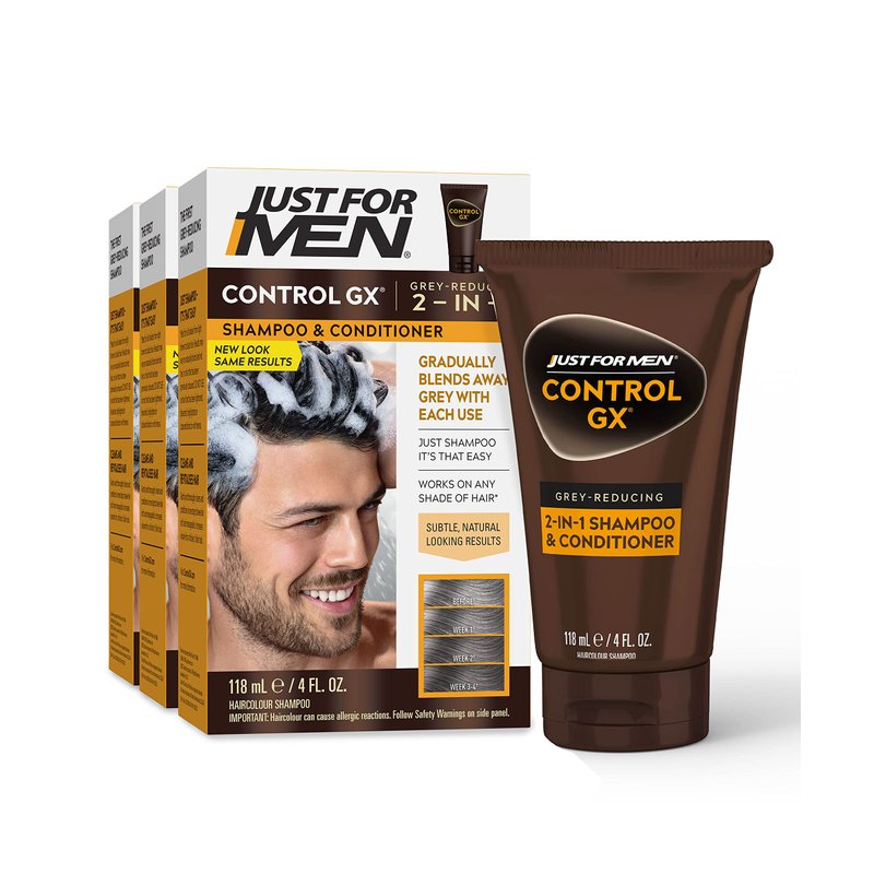 Just For Men Control GX Grey Reducing 2-in-1 Shampoo and Conditioner, Gradual Hair Color for Stronger and Healthier Hair, 4 Fl Oz - Pack of 3 (Packaging May Vary)