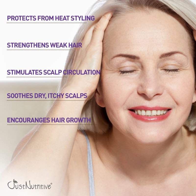 With Just Nutritive’s Adult Women’s Hair Treatment, begin your journey towards gaining fuller, thicker-looking hair. This hair growth product lightly conditions for a soft, manageable hair. It strengthens against breakage and adds shine with more fullness. This hair growth treatment is specially formulated to help with adult female hair. This lightweight formula for thinning hair is fast-absorbing and nourishes every hair strand giving it shine and volume. It helps soothe dry, itchy scalps while strengthening weak, thinning hair. This hair growth product also adds moisture to aid with damage caused by heat-styling tools. This hair loss treatment oil is boosted with vitamins that feed and volumize for thicker, fuller, and healthier hair. This works like a fertilizer for your hair and scalp. Formulated to repair from the inside out and to help restore strength, body, shine, and manageability while delivering nutritious richness for your hair and scalp. The nutritive ingredients also help stimulate blood flow and encourage hair growth. At Just Nutritive, we use no animal ingredients or do any animal testing. We assure you that every bottle is handmade with love in the USA and made of Earth’s purest ingredients. Together, let’s nourish with nature.