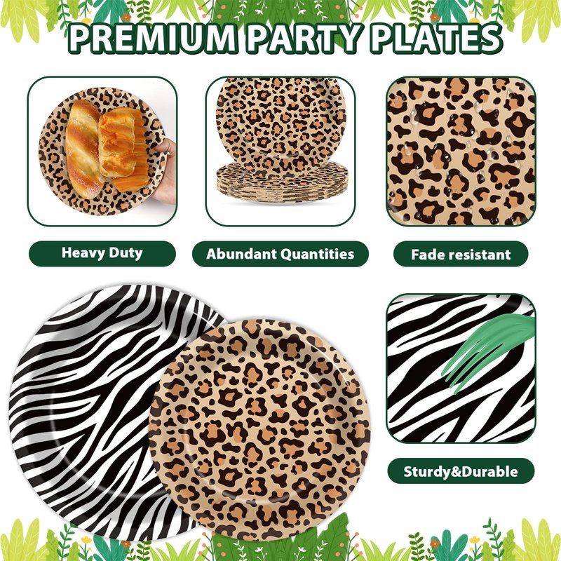 - Unique design: The unique design of this set features fun and playful elements, such as zebra stripes, leopard spots, and palm leaf patterns, making it ideal for kids and adults alike. The jungle-themed tableware brings a lively and adventurous vibe to any party, capturing the spirit of the wild.