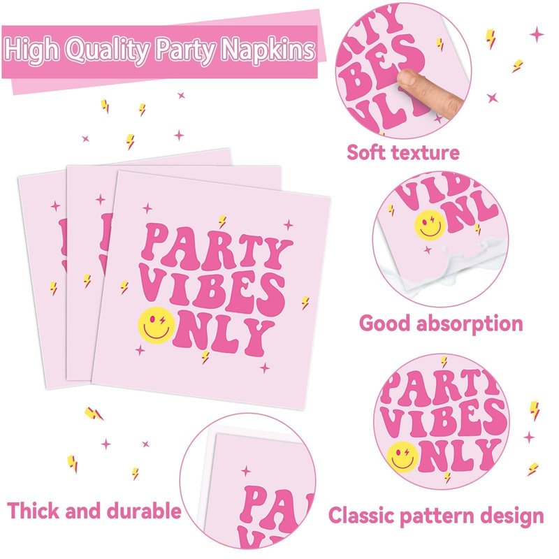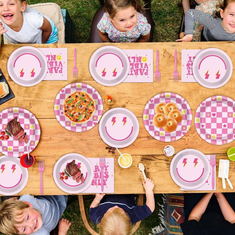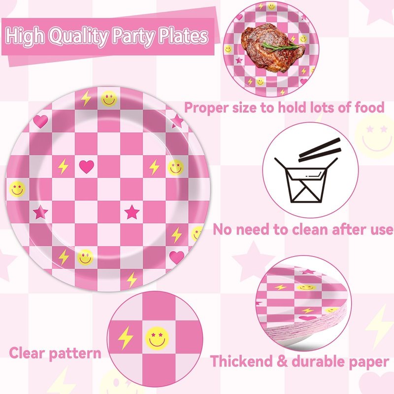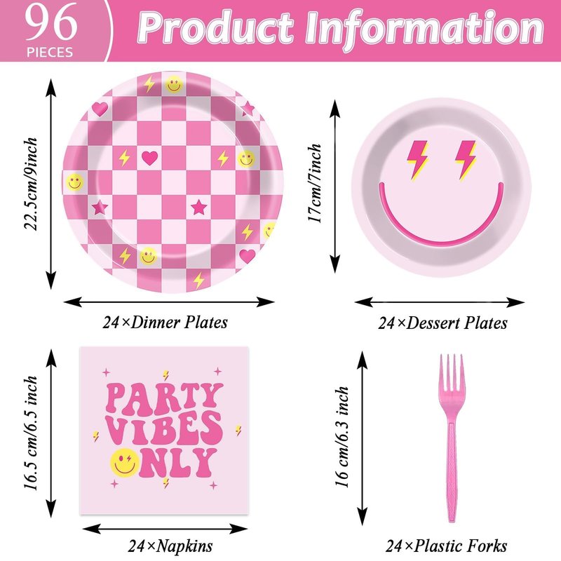 - Package includes: You'll get 24 pieces of 9in preppy party dinner plates, 24 pieces of 7in dessert plates, 24 pieces of pink smile face napkins 6.5in, and 24 pieces of plastic pink forks for each set that can serve 24 guests, creating a visually stunning table decor for your party.