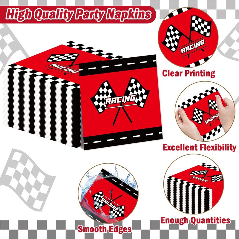 - Exciting racing design: Our race party plates showcase a bold red background with the word "Racing", along with classic black and white checkered flags and racetrack patterns. This vibrant design creates the ideal atmosphere for an exciting race-themed party, bringing an authentic and energetic touch to your decor.