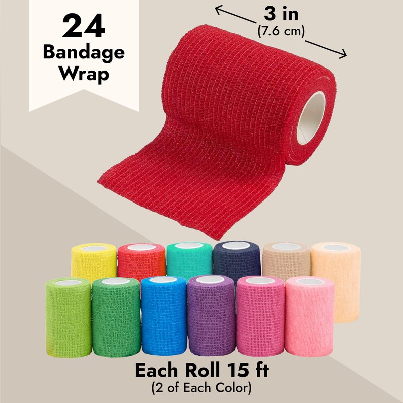 - Bulk Supply: In one convenient pack, you'll receive a total of 24 rolls of wound wrap self adherent, each measuring 3 inches by 5 yards, in 12 assorted colors, 2 of each color is included - tan, pink, magenta, green, orange, blue, navy blue, light green, teal, red, yellow, and purple - It's the perfect addition to your classroom, at-home first aid kits, or sports supplies, ensuring you're always well-prepared for any minor injuries or support needs