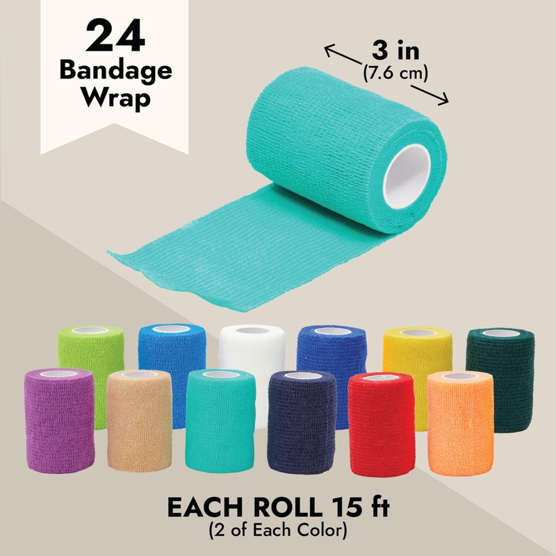 - Bulk Supply: In one convenient pack, you'll receive a total of 24 rolls of wound wrap self adherent, each measuring 3 inches by 5 yards, in 12 assorted colors, 2 of each color is included - tan, dark green, orange, blue, dark blue, navy blue, light green, teal, red, yellow, white, and purple - It's the perfect addition to your classroom, at-home first aid kits, or sports supplies, ensuring you're always well-prepared for any minor injuries or support needs