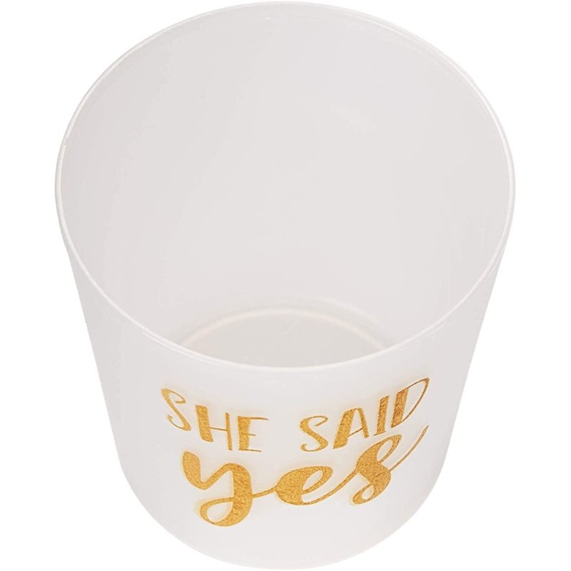 - TRANSPARENT PLASTIC: The shot glasses are transparent with gold writing that says "I said yes" and "She said yes."