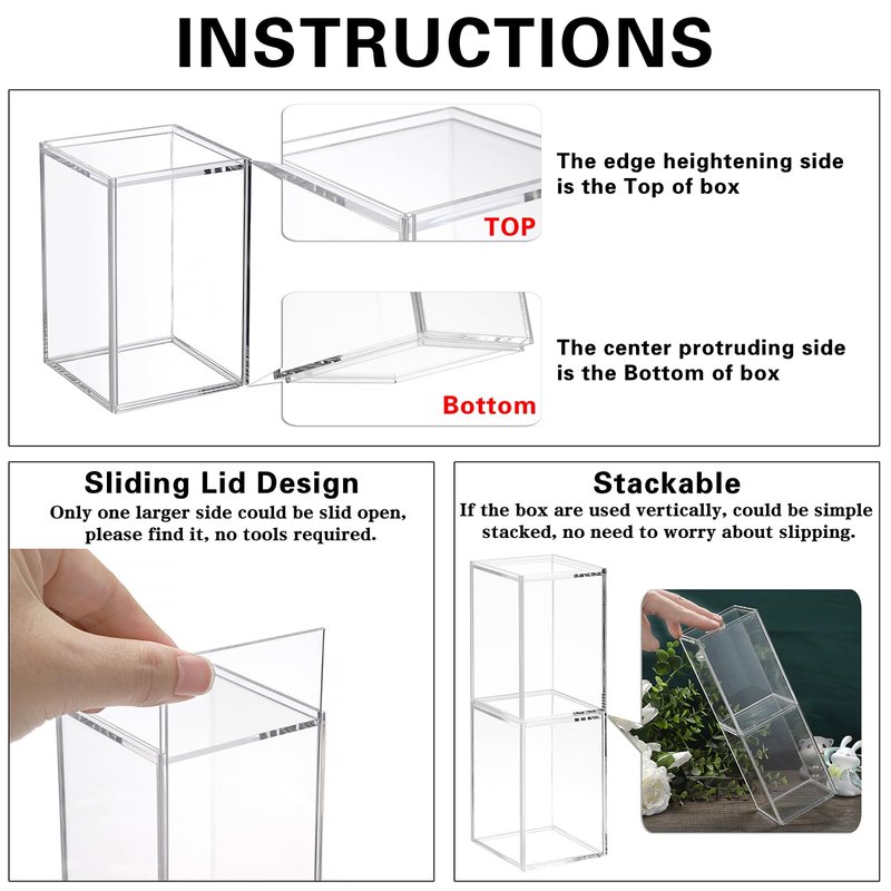 - Features a sliding door design, easy to use and no complicated assembly required. Stackable and looks good sitting on any desk, table, shelf. It not only store and display our collectibles, but also could be used to store our DIY small item like pearls, nail art supplies.