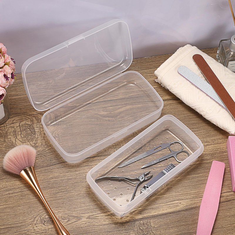 Plastic Sterilizing Tray for Nail Tool, Tweezer, and More The size of the tray is suitable for accommodating various nail art tools, including nail clippers, cuticle pushers, tweezers, and more. Its spacious interior allows for multiple tools to be sterilized simultaneously, saving time and effort. The tray is lightweight and easy to handle, making it a practical addition to any nail art workstation. FEATURES: Transparent - We can see what is inside of it without opening it. Drainage Tray - A removable drain tray has many holes for good drainage. Lightweight - The sterilizing tray is lightweight and portable, which makes it convenient for both home use and travel. Easy to Clean - The smooth plastic surface can be easily wiped clean or washed with soap and water. Multipurpose - This box can be used as a sterilizing box for nail clippers, tweezers, nail drill bits and other nail art tools. Wide application - The manicure tool sterilizing tray is suitable for nail professionals, nail salon, nail school or home use.