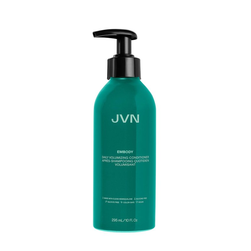 JVN Embody Daily Volumizing Conditioner - Adds body, strength & moisture. A clean, volume-boosting conditioner that adds fullness, gently detangles and restores shine without build up or weighing down hair. Works to improve thickness and resilience while adding bounce and vitality to limp strands. Light creamy texture saturates hair yet rinses clean. Great for daily use on all hair types, including color-treated hair. Reduces hair breakage by 51% 93% agree hair feels thicker *Based on a 21 day consumer study of 40 subjects, daily use 93% saw less hair fall *Based on a 21 day consumer study of 40 subjects, daily use Hair density is visibly improved by 9% *In a controlled study vs a non conditioning shampoo, after one use SUITABLE FOR: Fine, medium, thick, straight, wavy, curly, coily hair ESPECIALLY GOOD FOR: Fine hair, thinning hair, limp or flat hair SCENT: Rich notes of sandalwood and amber are accented by lush jasmine, sparkling cassis, and radiant bergamot. INGREDIENTS: HEMISQUALANE - Improves hair health and strength instantly and over time. Smoothes, strengthens, protects color and reduces damage. BIOTIN - Also known as vitamin B7, helps to improve hair thickness. BAMBOO EXTRACT - Rich in natural silica, adds volume and shine. HOW TO USE- After shampooing, squeeze out excess water and apply evenly to hair, then rinse. Leave on a little longer if you need to.