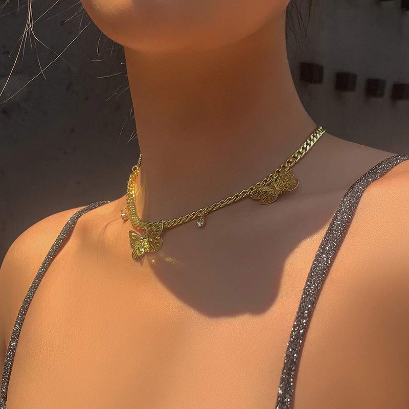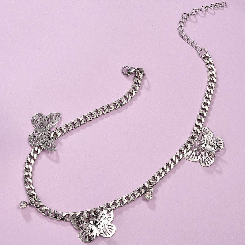 JWICOS Silver Necklace for Women and Girls Butterflies and Rhinestones Pendant Chunky Chain Miami Cuban Link Chain One Layered Choker for Women (Silver)