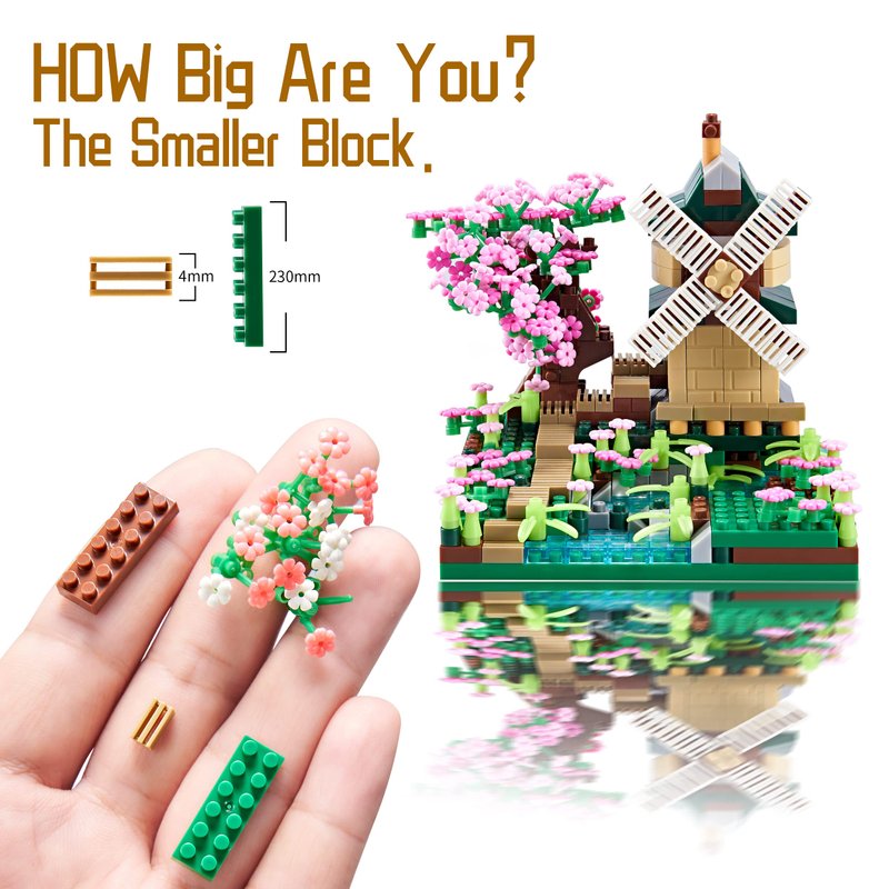 - The Cute Mini Sets - River Windmill Model: The small size of these mini building blocks, minimum size just 0.15in*0.15in. The Cherry Blossom Flower construction toy included 600+ PCS and a finished product is measuring length, width and height are 3.15in, 3.15in and 3.35in