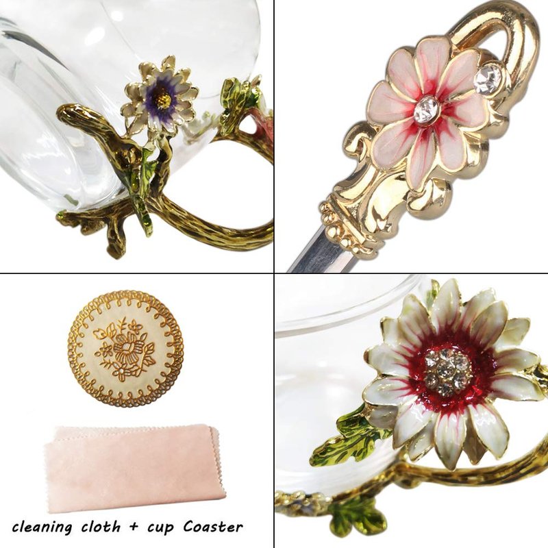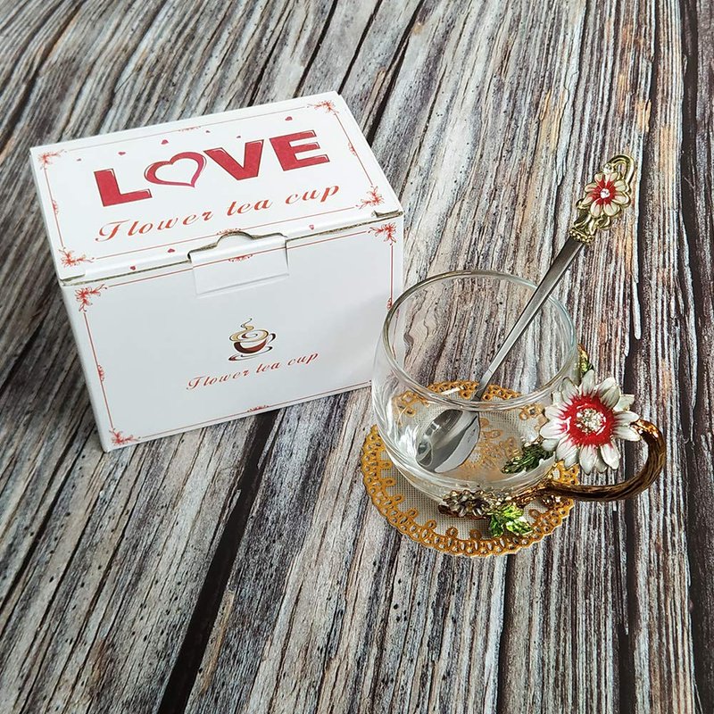 JY-Danbady Enamel Sunflower Crystal Lead-Free Glass Tea Cup with Spoon Set, Present for The Christmas, Valentine's Day.Best Present for Mother, Grandma, Girlfriend, Sister.